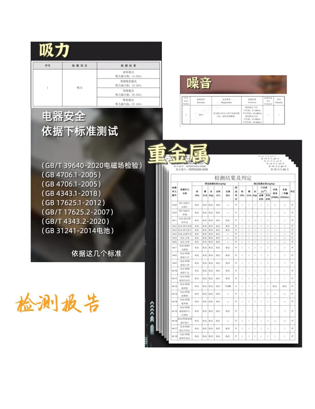 老爸評測檢測了鄰苯、多環(huán)芳烴、異味、重金屬遷移等等,還對電器安全進行了檢測,包括噪音問題、吸力問題,所有的結(jié)果都是符合標準要求的。